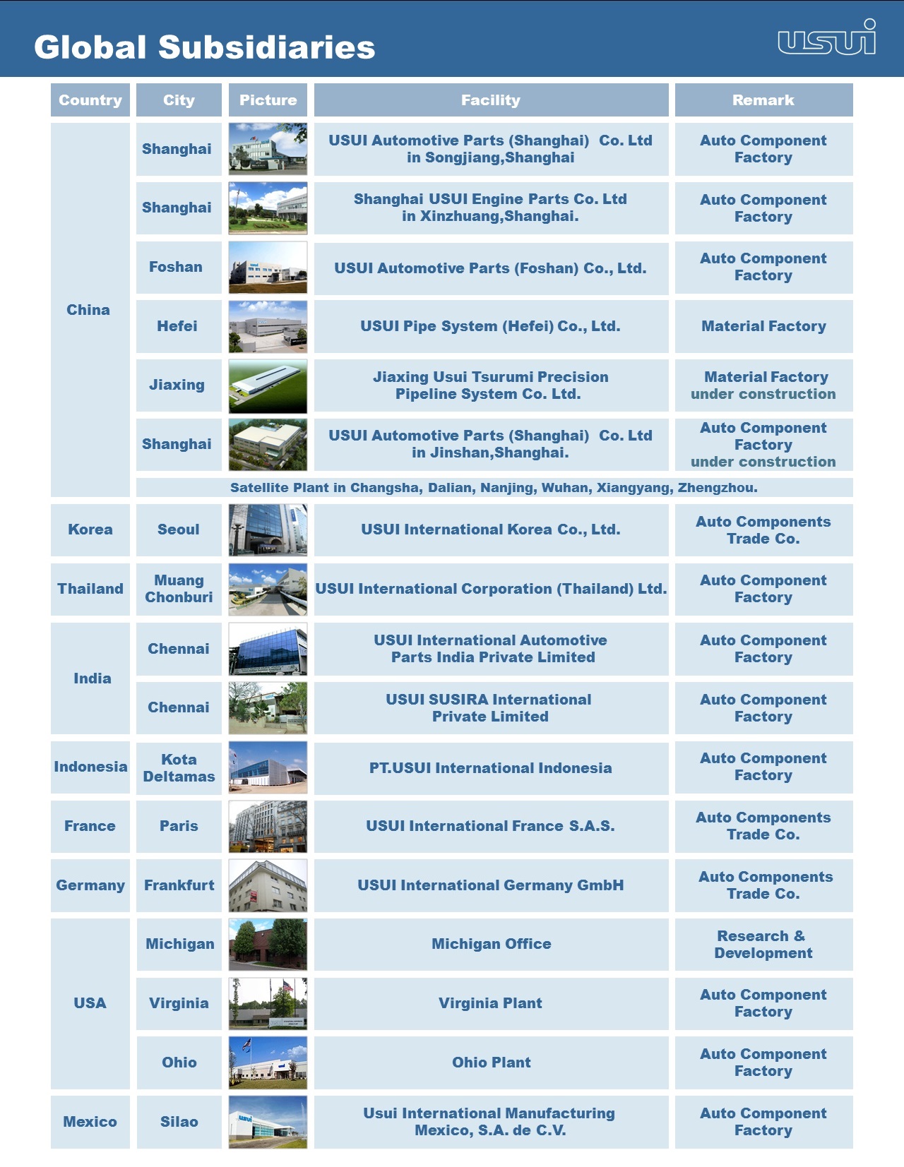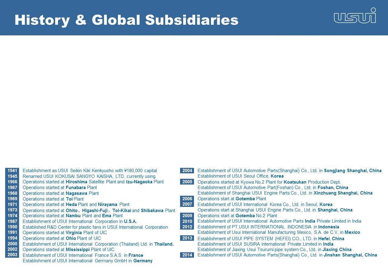 臼井国际在亚洲、欧洲和北美11个国家设有43家分支机构。